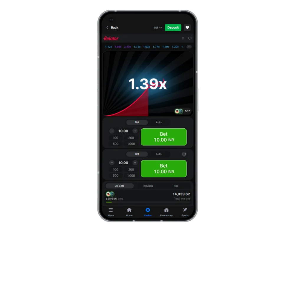 New players receive a 500% bonus up to ₹75,000 on their first casino deposit. This offer applies to Aviator and other casino games.