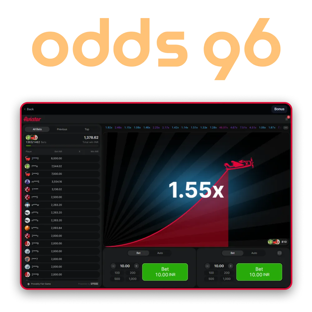 Odds96 offers a welcome package to new casino players who want to try Aviator. You receive 100% up to ₹20,000 on your first deposit plus 200 free spins on selected slots. The minimum deposit is ₹500. Wagering requirements are set at 35x the bonus amount. You must complete wagering within 30 days. The bonus applies to casino games, including Aviator. Free spins are credited in batches of 20 per day for 10 days.